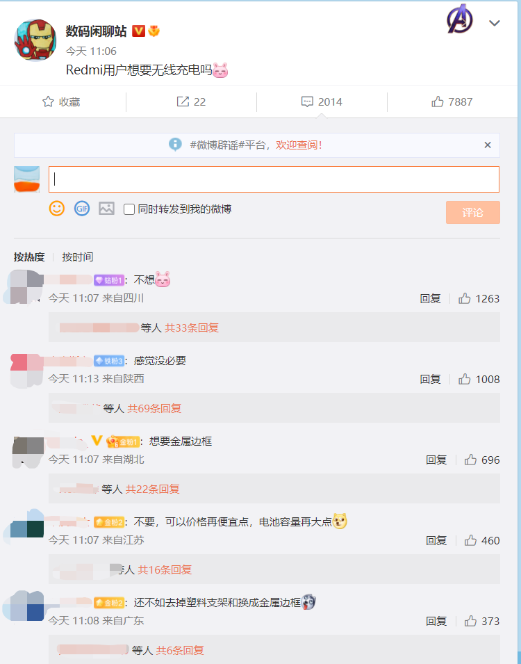 据微博博主 @数码闲聊站 透露,Redmi 的新品有望支持无线充电新特性。结果评论显示,大量网友可能并不想要“无线充电”,而是更想要金属边框,或者手机价格再便宜些、电池容量更大些。
